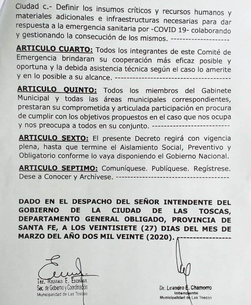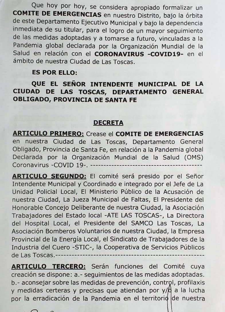 Serán funciones del comité: seguimientos de las medidas adoptadas; aconsejar sobre las medidas de prevención, control, profilaxis, medidas certeras y precisas que atiendan por y/o a la lucha por la erradicación de la pandemia en el territorio de la ciudad de Las Toscas; definir los insumos críticos y recursos humanos, materiales adicionales e infraestructuras necesarias para dar respuestas a la emergencia sanitaria por –COVID 19- colaborando y gestionando la consecución de los mismos.