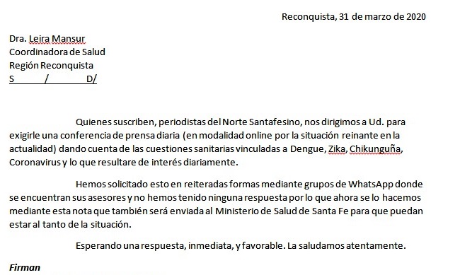 Quienes suscriben, periodistas del Norte Santafesino, nos dirigimos a Ud. para exigirle una conferencia de prensa diaria (en modalidad online por la situación reinante en la actualidad) dando cuenta de las cuestiones sanitarias vinculadas a Dengue, Zika, Chikunguña, Coronavirus y lo que resultare de interés diariamente.
