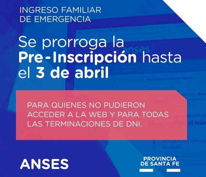 Y precisó: “Una tiene que ver con la prórroga de la preinscripción del Ingreso Familiar de Emergencia, que comienza el miércoles 1 de abril y se va a extender hasta el viernes 3, cuando se hará el cierre. Es importantes aclarar esto porque a raíz de las consultas de cómo hacían para inscribirse aquellas personas que según la terminación del DNI y no lo había podido realizar, ponemos a disposición estos tres días para que puedan ingresar y hacer la solicitud, que es muy sencilla. En ella tienen que poner el CUIL, y el sistema le avisa que la Ansés ha tomado la solicitud”.