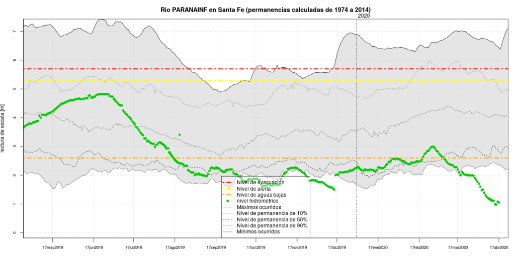 La Secretaría de Recursos Hídricos realiza un monitoreo de las alturas hidrométricas. El tramo medio del río retomó la tendencia bajante desde principios de marzo 2020 hasta la fecha y continúa con un constante ritmo de descenso.