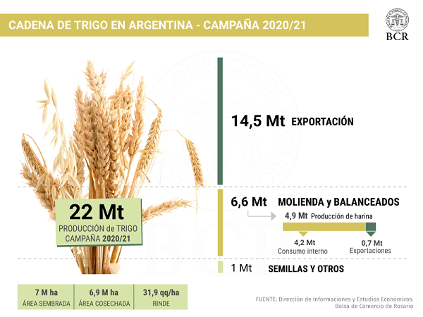 En base a esta proyección de cosecha de trigo 2020/21 de 22 millones de toneladas, la nueva campaña puede dejar como saldo una marca histórica en exportaciones de cereal. En efecto, los despachos al exterior de grano podrían alcanzar los 14,5 millones de toneladas, más de 2 millones por encima de lo exportado en la campaña actual y superando en 1,7 Mt el récord anterior de 12,8 Mt obtenido en la campaña 2016/17. Molienda y balanceados, en tanto, muestran un consumo más estable a largo plazo previéndose que absorberían 6,6 millones de toneladas, en tanto que otro millón de toneladas se reservaría como uso para semilla y uso residual.