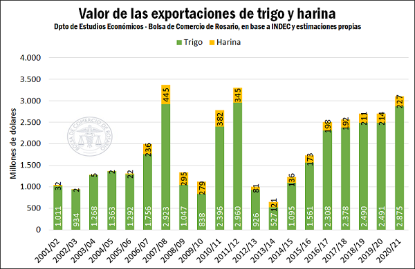 Se proyecta en base a los precios actuales de los embarques futuros que el valor de la exportación de 14,4 millones de toneladas de grano de trigo ascienda a US$ 2.875 millones, en tanto que el valor de los despachos de harina totalizaría otros US$ 227 millones. De este modo, el complejo triguero podría dejar como saldo un ingreso de divisas al país de más de US$ 3.100 millones durante el ciclo comercial 2020/21. Esta proyección se encuentra un 18% por encima del valor de las exportaciones previsto para la campaña actual, gracias al aumento en las cantidades.