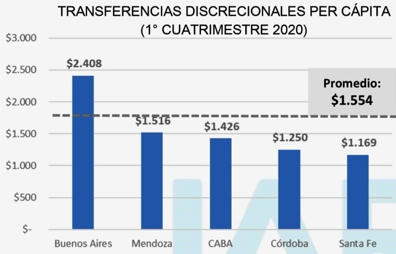El informe mencionado por Ulieldin también señala que, de ese reparto, Buenos Aires, Santa Cruz, Entre Ríos y La Rioja fueron las que mayores recursos recibieron, mientras que “Santa Fe fue la que menos obtuvo. Medido en términos absolutos, ese reparto se traduce en que La Rioja recibió 7.711 pesos por habitante en el cuatrimestre señalado, mientras que Santa Fe el equivalente a 1.169, y el nivel medio de tal reparto la suma de 2.200 pesos por habitante”.