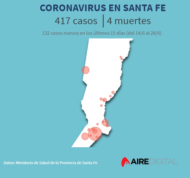 Del 14 de junio a la fecha, la provincia de Santa Fe pasó de 285 casos de coronavirus a 417. Sumó 132 en 15 días -al 28/6-, lo que representa un incremento del 46%. Los nuevos casos se distribuyen en 21 localidades, pero la mayor concentración se encuentra en el sur provincial.