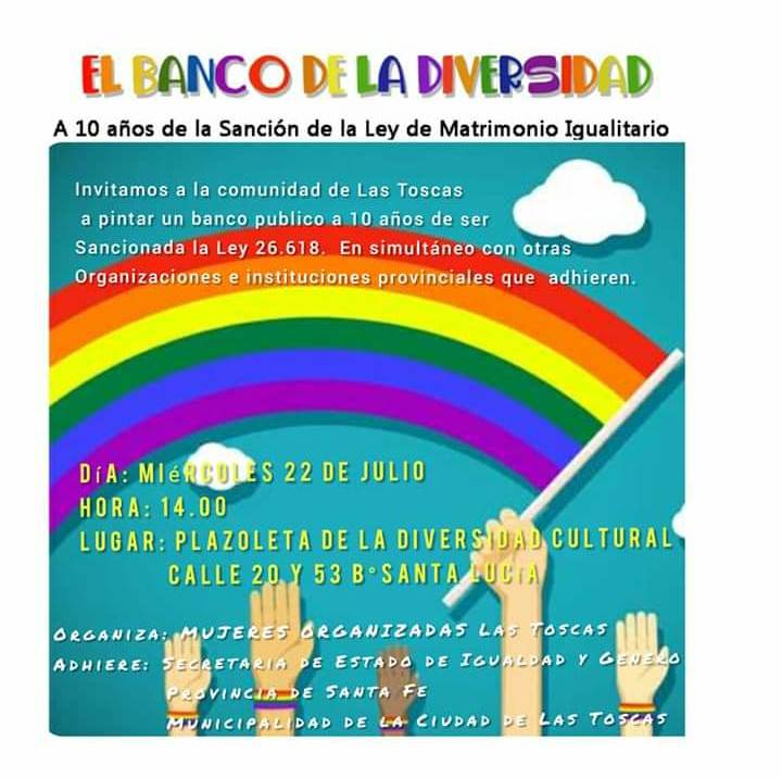 Mujeres Organizadas de la ciudad de Las Toscas invitan a la comunidad a acercarse a la plazoleta de la Diversidad Cultural en barrio Santa Lucía, a pintar un banco en apoyo a la diversidad sexual y de género en el marco de los 10 años de la Ley de Matrimonio Igualitario en Argentina.