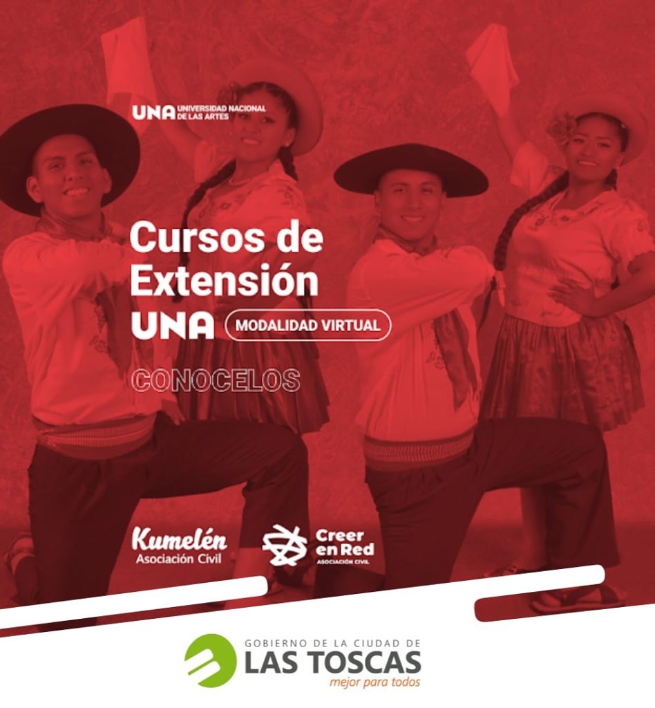 A través de un convenio entre la UNA y “Kumelén, Asociación Civil” al cual se suma “Creer en Red, Asociación Civil”, la municipalidad de Las Toscas hace llegar a las y los intersados, la extensa nómina de Cursos de Extensión de la UNA Folklore que se realizarán de manera 100% virtual.