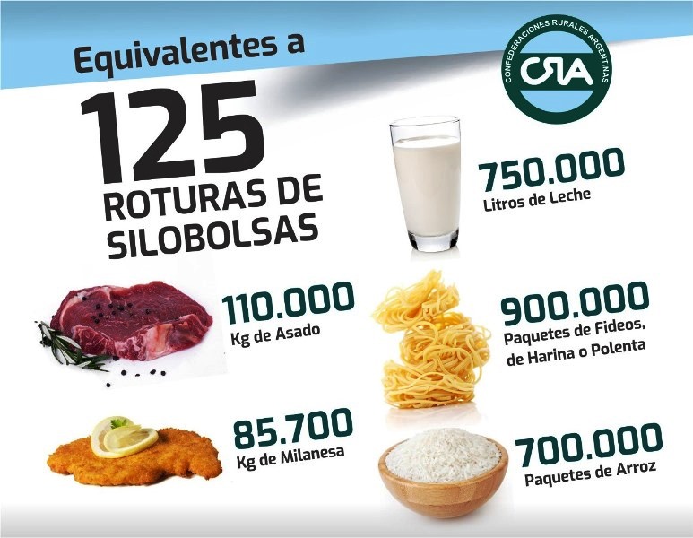De acuerdo al Departamento Económico de CRA, a cargo del ingeniero agrónomo Matías Lestani, en números, las 125 roturas de silobolsas es equivalente a 12.500 tn. afectadas y pudriéndose a la intemperie entre el agua y el barro se podrían haber destinado a: 1750 jubilaciones mínimas; 3000 Planes IFE (Ingreso Familiar de Emergencia); 673.000 raciones de comedores comunitarios; 900.000 paquetes de fideos, de harina o polenta; 750.000 litros de leche; 700.000 paquetes de arroz; 110.000 kg de asado; 85.700 kg de milanesas.