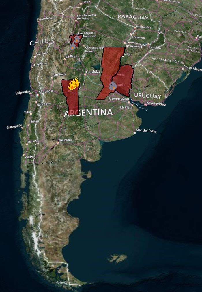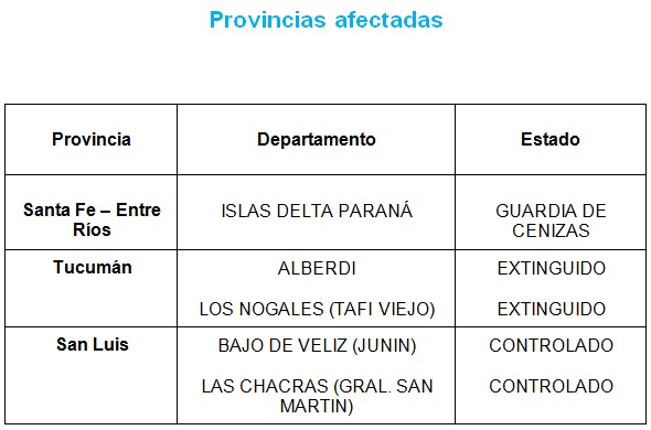 Al momento de elaborarse este informe se registran las siguientes provincias afectadas por incendios en nuestro país.