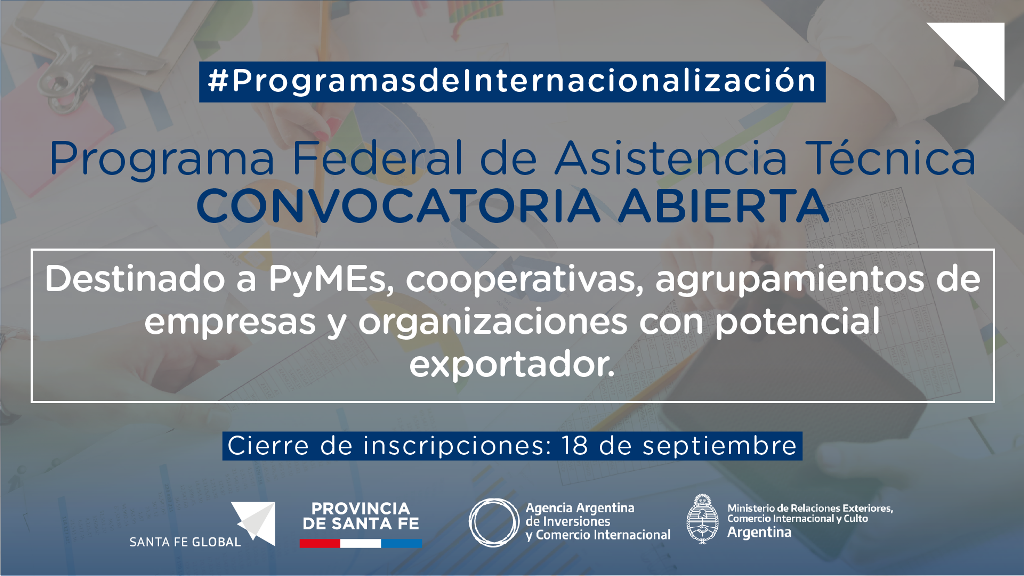 La Secretaría de Comercio Exterior del Ministerio de Producción, Ciencia y Tecnología de la provincia, junto a la Agencia Argentina de Inversiones y Comercio Internacional, y las cámaras de Comercio Exterior de la provincia, convocan a PyMEs, cooperativas y agrupamientos de empresas a participar del “Programa Federal de Asistencia Técnica en Negocios Internacionales».