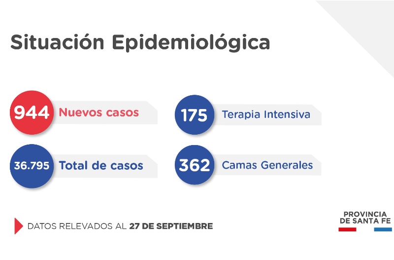 Informe diario 27 septiembre 2020El Ministerio de Salud de Santa Fe, a través de la Dirección Provincial de Epidemiología, informa a la población que en el día de la fecha se han confirmado 944 casos nuevos de COVID-19, en el territorio provincial.