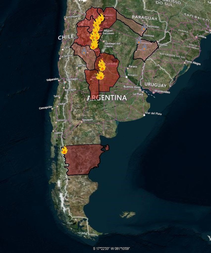 Al momento de elaborarse este informe se registran las siguientes provincias afectadas por incendios en nuestro país.