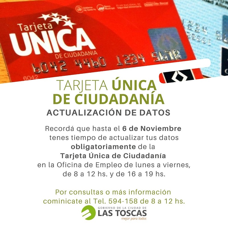 Hasta mañana 6 de noviembre continúan con la actualización OBLIGATORIA de datos de la TARJETA ÚNICA DE CIUDADANÍA en la Oficina de Empleo de lunes a viernes, 8 a 12 hs y de 16 a 19 hs.