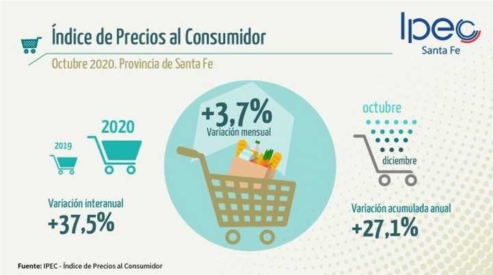 El Nivel general del Índice de Precios al Consumidor de Santa Fe (IPC_SF) registró en octubre de 2020 un aumento de 3,7% con relación al mes anterior.