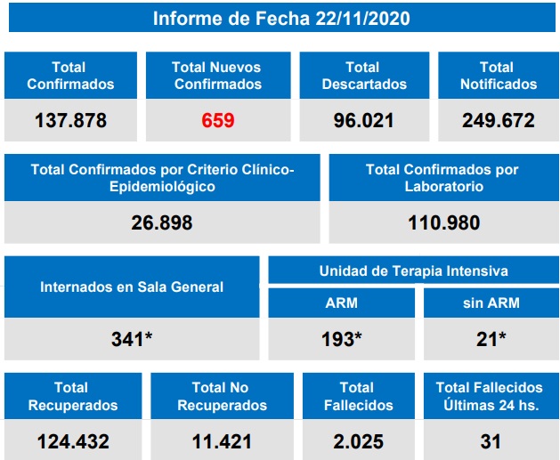2020-11-22 19.30 hs-Parte MSSF CoronavirusCovid-19: Provincia Santa Fe informó 659 nuevos casos y 31 fallecidos