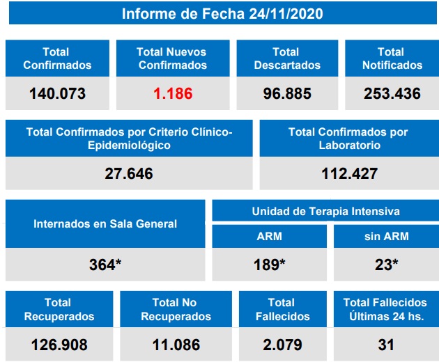 El Ministerio de Salud de la provincia informó 1.186 nuevos casos positivos de COVID-19 y 31 fallecidos en todo el territorio provincial.