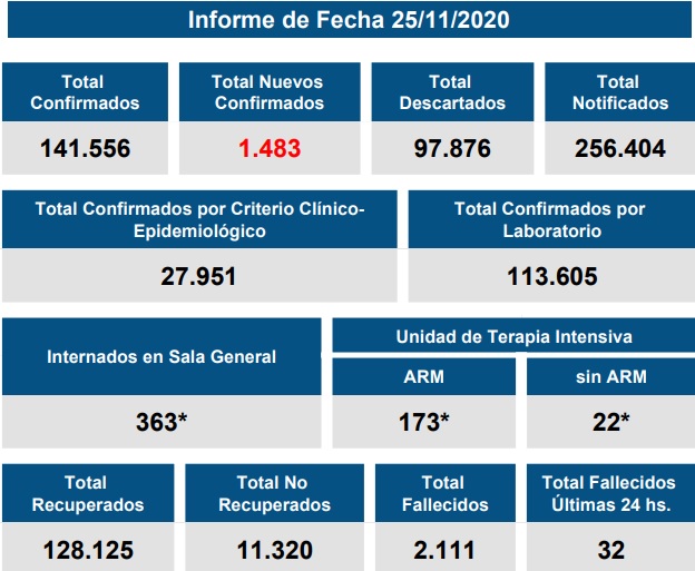 2020-11-25 19.30 hs-Parte MSSF CoronavirusCovid-19: Provincia Santa Fe informó 1.483 nuevos casos y 32 fallecidos