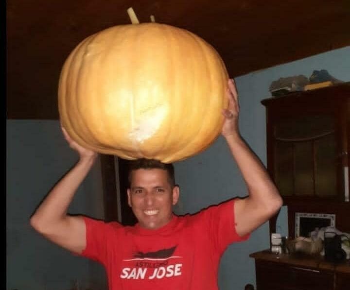 Los hermanos Walter y Martín Marchetti de Fortín Olmos, cosecharon de su huerta un zapallo criollo de unos 30 kilogramos aproximados, minutos antes de que se produzca el gran temporal que se desató este pasado domingo en la región.