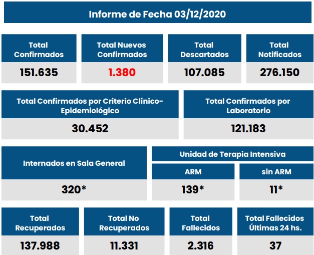 2020-12-03 19.30 hs-Parte MSSF CoronavirusProvincia Santa Fe informó 1.380 nuevos casos y 37 fallecidos de Covid-19