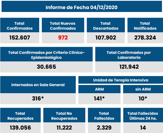 2020-12-04 19.30 hs-Parte MSSF CoronavirusProvincia Santa Fe informó 972 nuevos casos y 14 fallecidos de Covid-19