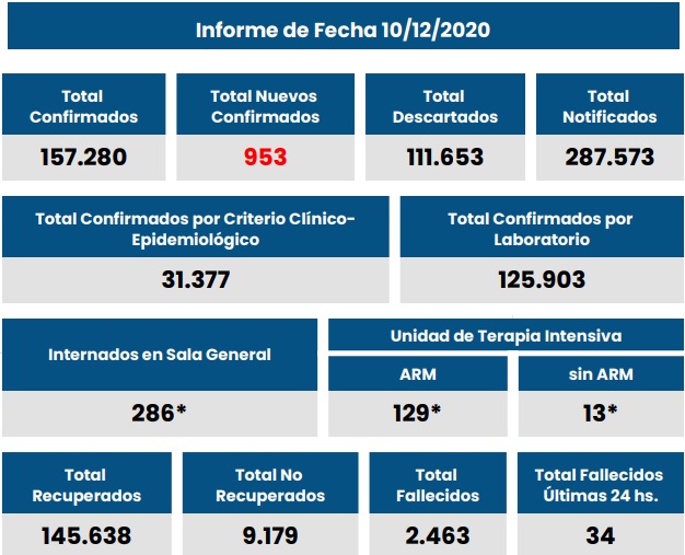 2020-12-10 19.30 hs-Parte MSSF CoronavirusCovid-19: Provincia Santa Fe informó 953 nuevos casos y 34 fallecidos de