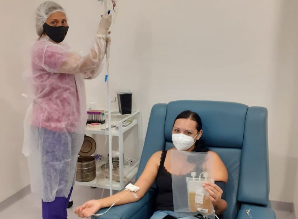 La profesional detalló que «estamos utilizando este procedimiento para la extracción de plasma, mediante la técnica llamada aféresis semiatomático, para el cual utilizamos descartables hechos para tal fin, y no la máquina de aféresis convencional. Parte del procedimiento se realiza manualmente y la otra con la centrífuga refrigerada de bolsa. Se obtiene solamente el plasma y los glóbulos rojos del donante se los volvemos a reinfundir.