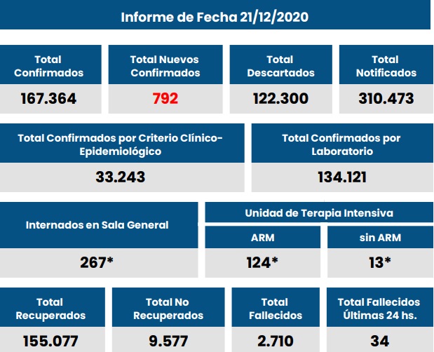 2020-12-21 19.30 hs-Parte MSSF CoronavirusProvincia Santa Fe informó 792 nuevos casos y 34 fallecidos de Covid-19