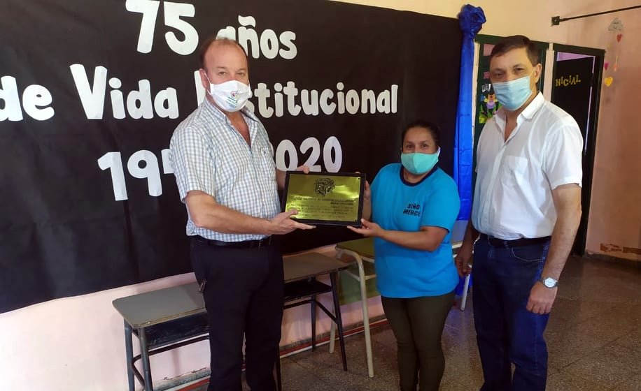 El intendente Enrique Paduán, acompañado por el secretario de Cultura y Comunicación de la Municipalidad de Villa Ocampo, Guillermo Scarpin, visitaron la Escuela 6330 “Tiburcio Aldao” de Campo Píccoli para hacer entrega a la directora del establecimiento, Mercedes Rodríguez, de una placa conmemorativa al 75º Aniversario de la institución escolar, cumplido el pasado mes de octubre.