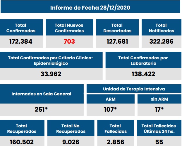 2020-12-28_Parte_MSSF_CoronavirusProvincia Santa Fe informó 703 nuevos casos y 55 fallecidos de Covid-19