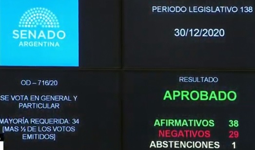 Tras varias horas de debate, 38 senadores votaron a favor, 29 en contra, 1 se abstuvo y 4 no asistieron. Ya había sido aprobado en la Cámara de Diputados el 11 de diciembre.
