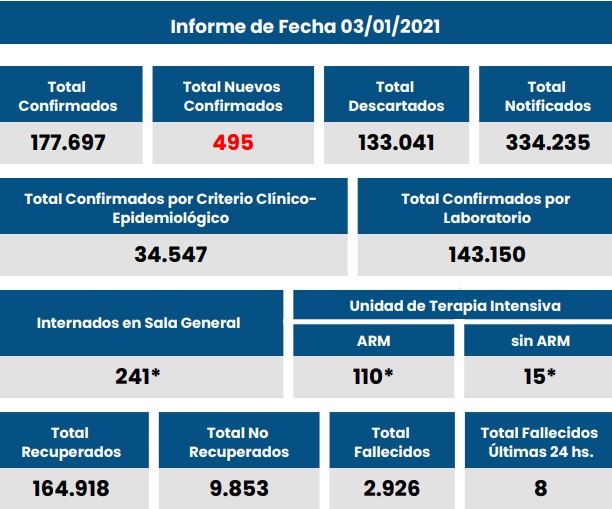 2021-01-03_Parte_MSSF_CoronavirusProvincia Santa Fe informó 495 nuevos casos y 8 fallecidos de Covid-19