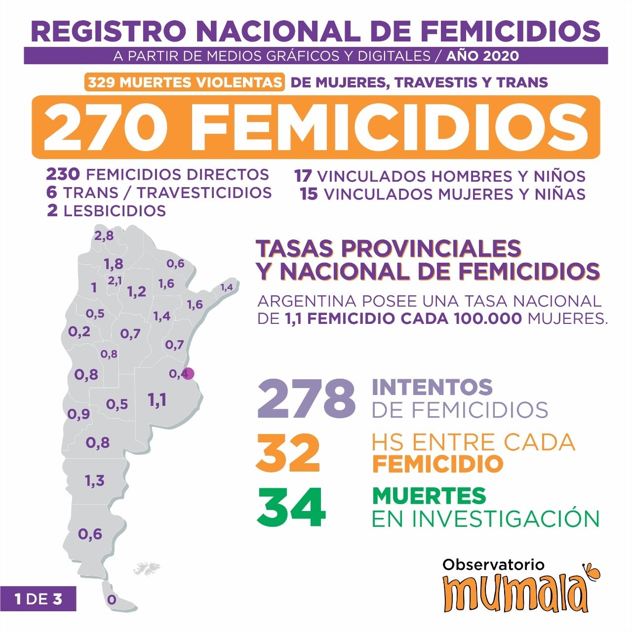 – Se perpetraron 329 muertes violentas de mujeres, travestis y trans de las cuales 270 son femicidios directos, femicidios vinculados y trans- travesticidios.