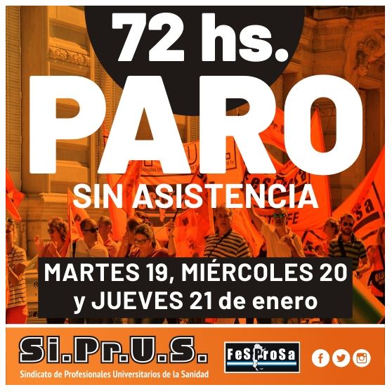 Luego del importante acatamiento de las medidas de fuerza de esta semana, y ante la falta de convocatoria al sindicato mayoritario de los profesionales, se ratifica el paro de 72 hs para martes 19, miércoles 20 y jueves 21.