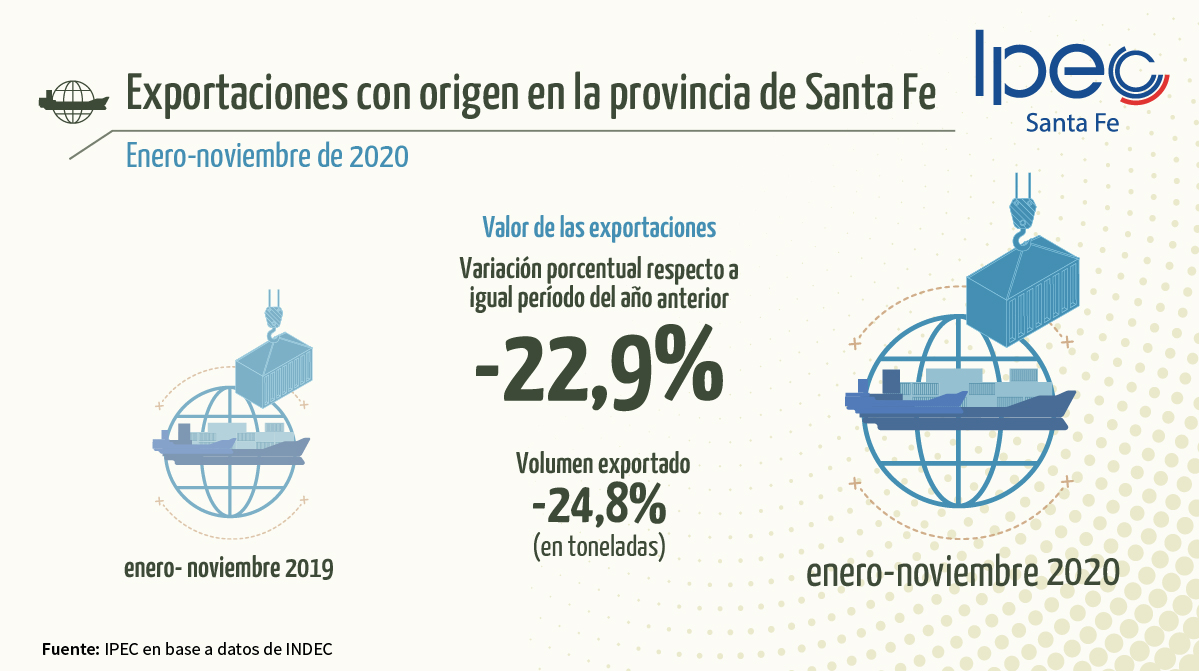 El Instituto Provincial de Estadística y Censos publicó el informe «Exportaciones con origen en la provincia de Santa Fe» correspondiente a enero – noviembre 2020.
