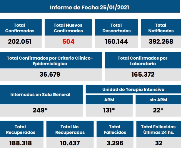 2021-01-25_Parte_MSSF_CoronavirusProvincia Santa Fe informó 504 nuevos casos y 32 fallecidos de Covid-19