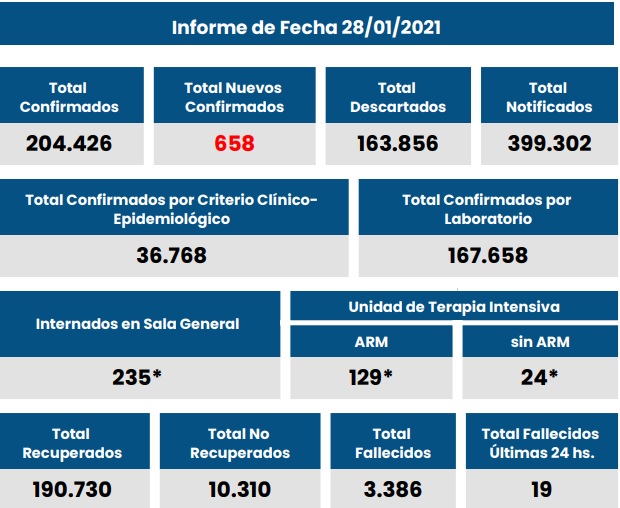 2021-01-28_Parte_MSSF_CoronavirusProvincia Santa Fe informó 658 nuevos casos y 19 fallecidos de Covid-19