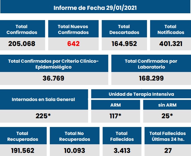 2021-01-29_Parte_MSSF_CoronavirusProvincia Santa Fe informó 642 nuevos casos y 27 fallecidos de Covid-19