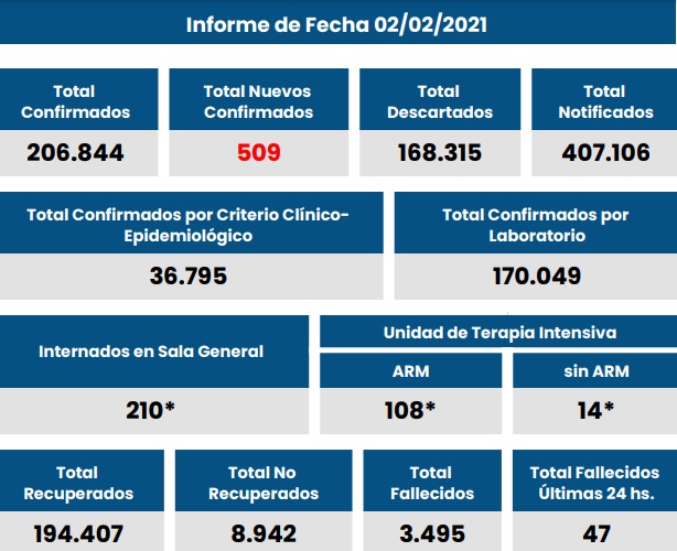 2021-02-02 19.30 hs-Parte MSSF CoronavirusCovid-19: Provincia Santa Fe informó 509 nuevos casos y 47 fallecidos