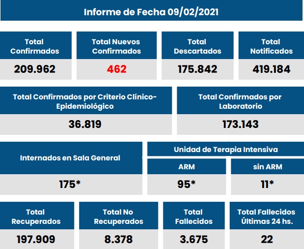 2021-02-09_Parte_MSSF_CoronavirusCovid-19: Provincia Santa Fe informó 462 nuevos casos y 22 fallecidos