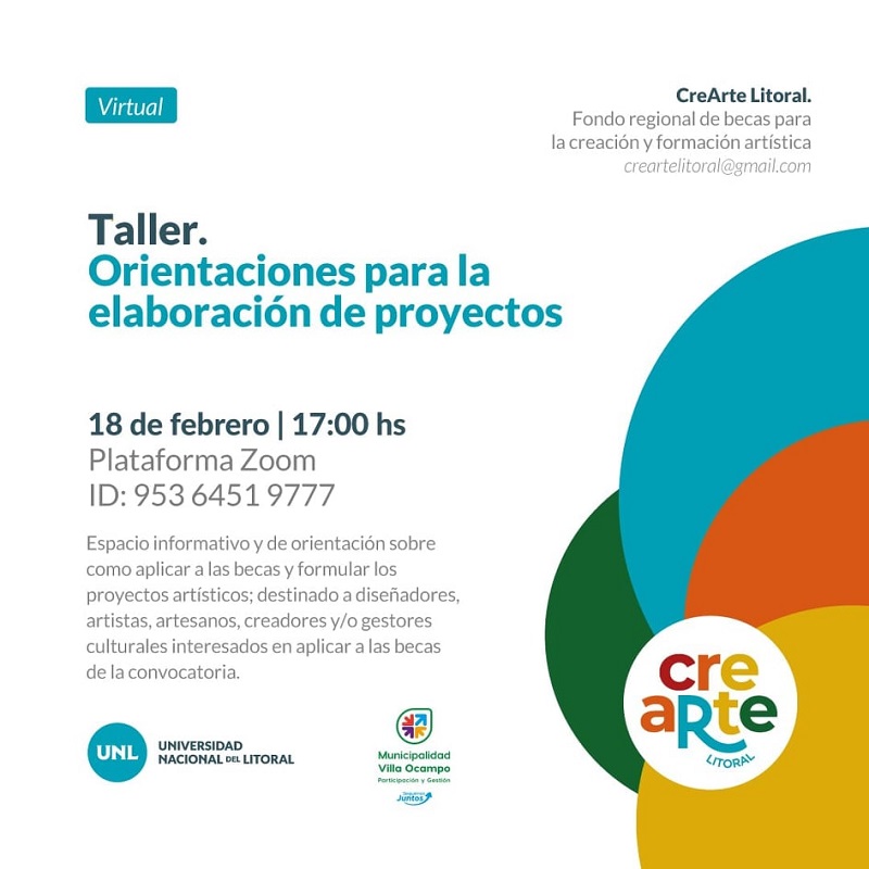 La Secretaría de Cultura y Comunicación de la Municipalidad de Villa Ocampo invita a participar en forma virtual (vía Zoom) del Taller de Orientación para la Elaboración de Proyectos del Programa «Crearte Litoral» que brindará la Universidad Nacional del Litoral (UNL) este jueves 18 de febrero, a las 17:00 Hs.