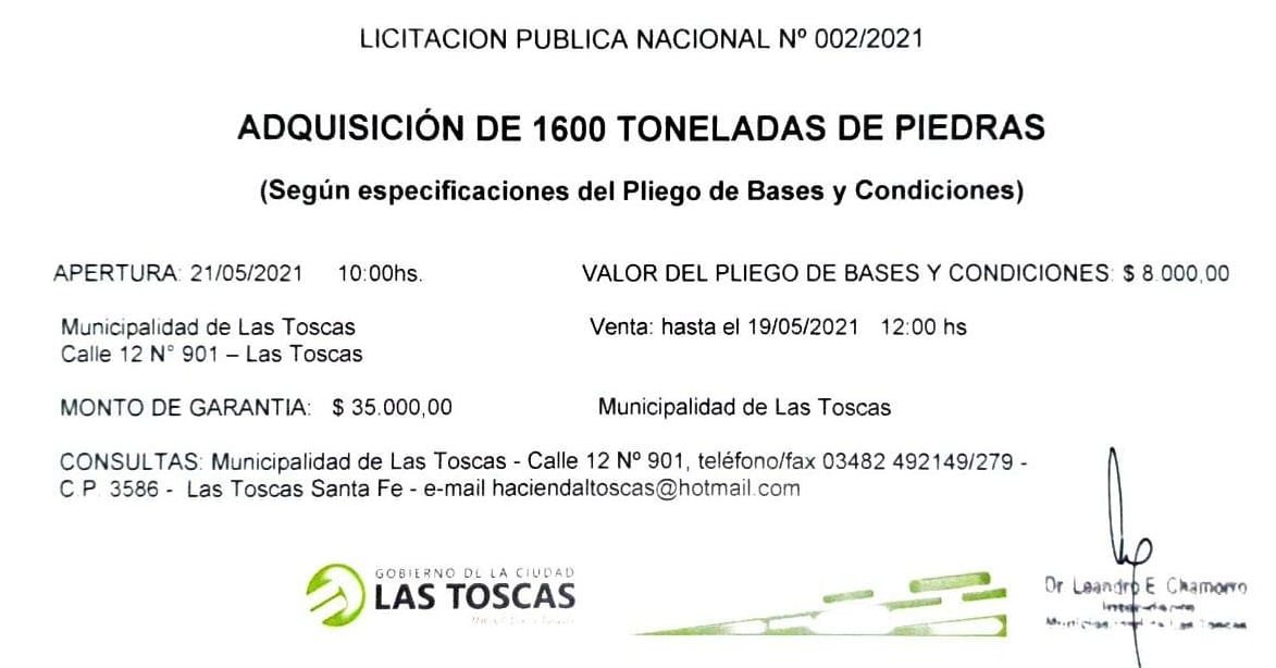 Destacadassociales Las Toscas: Licitación para adquisición de 1.600 toneladas de piedras 7 mayo, 2021 Compartir en Facebook Compartir en Twitter tweet LLAMADO A LICITACIÓN PARA LA ADQUISICIÓN DE 1600 TONELADAS DE PIEDRAS