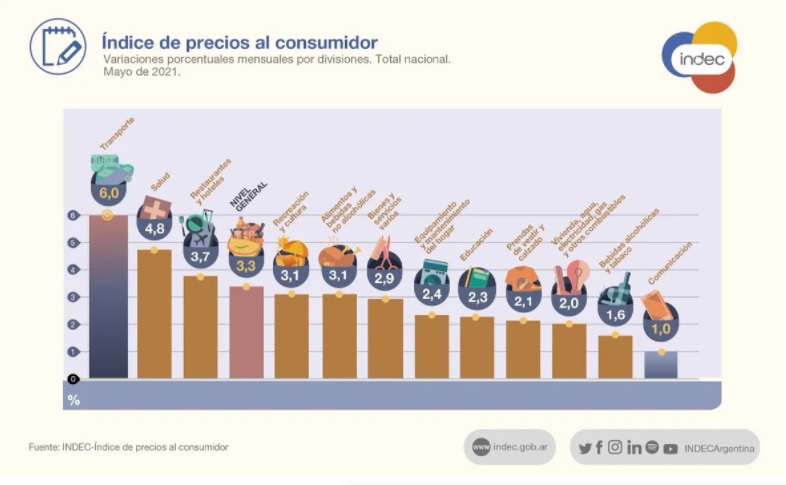 Con esta suba, la inflación minorista en los primeros cinco meses del año alcanzó al 21,5% y en los últimos 12 meses acumuló un incremento de 48,8% informó el organismo.