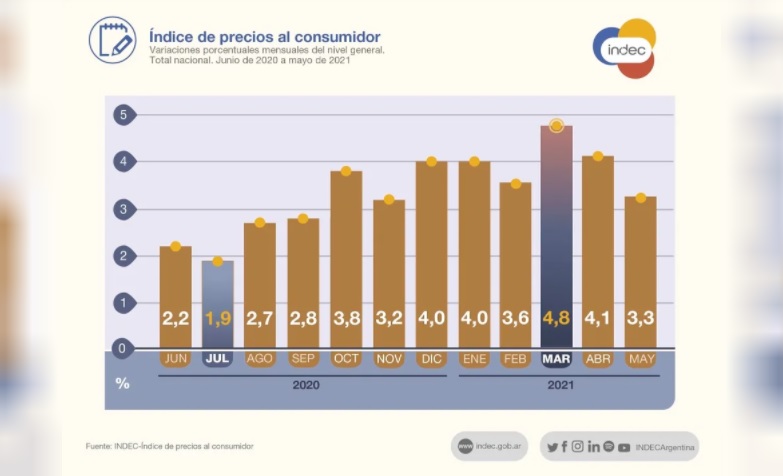 El índice de precios al consumidor (IPC-Costo de Vida) aumentó durante mayo 3,3%, por debajo del 4,1% registrado en abril pasado, informó este miércoles el Instituto Nacional de Estadística y Censos (Indec).