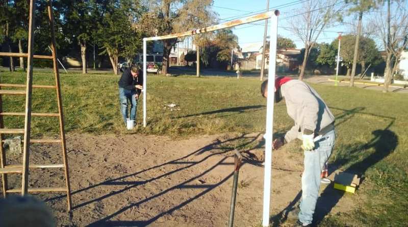 La Municipalidad de Las Toscas estuvo refaccionando y pintando arcos de canchas de fútbol en los barrios Virgen Asunta y San Agustín.