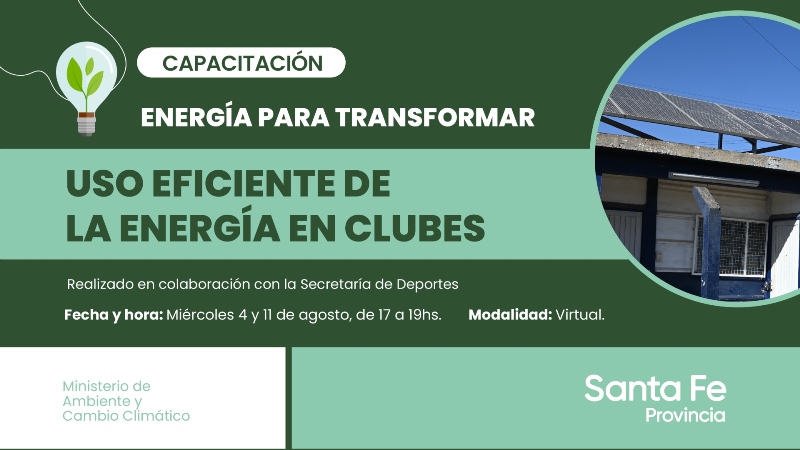 La provincia de Santa Fe, a través del Ministerio de Ambiente y Cambio Climático, presenta el segundo encuentro del ciclo – debate “Energía para Transformar”, denominado “Uso Eficiente de la Energía en Clubes”.