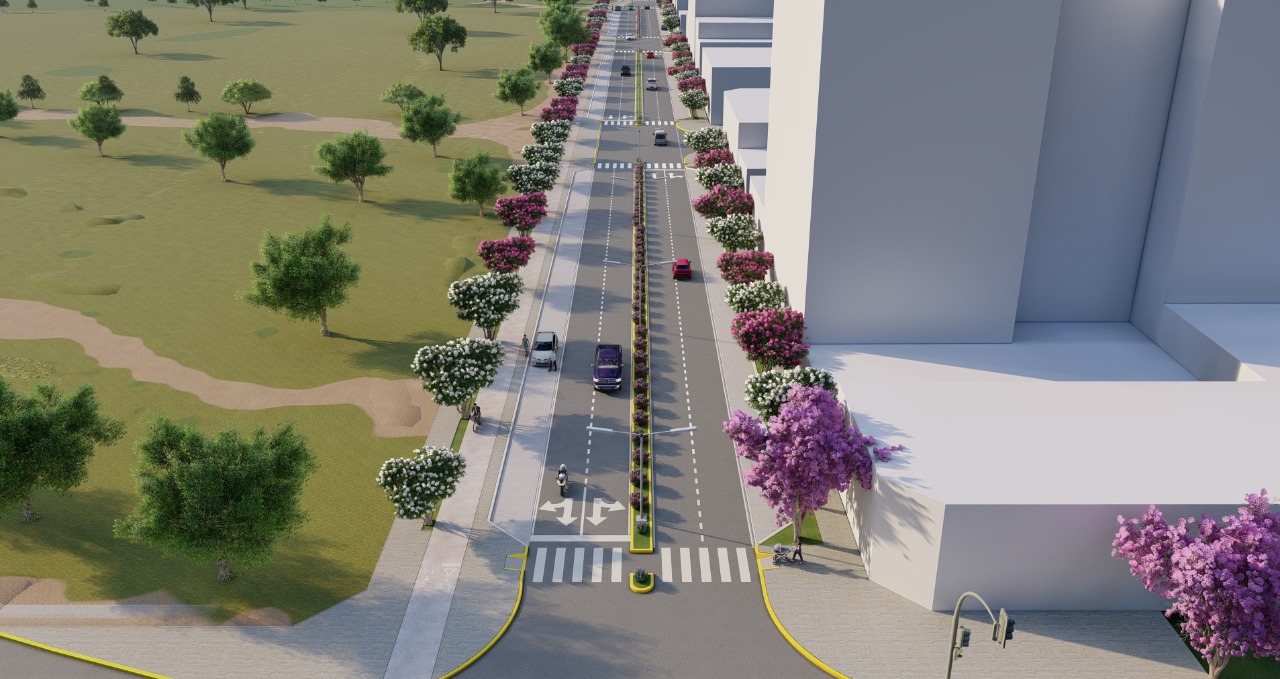 Por ahora serán 300 metros de bulevar, cantero central (con plantas, no árboles) con carriles y estacionamiento de ambos lados y bicisenda del lado Norte, todo con la correspondiente iluminación especial.