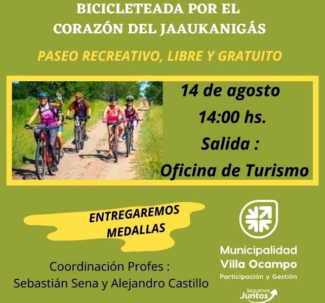 La Dirección de Deportes de la Municipalidad de Villa Ocampo invita a participar de la “Bicicleteada por el Corazón del Jaaukanigás”, un paseo recreativo, libre y gratuito, que se realizará este sábado 14 de agosto, desde las 14:00 Hs. con salida desde la Oficina de Turismo, en el ingreso principal de la ciudad. El registro de participantes comenzará una hora antes.