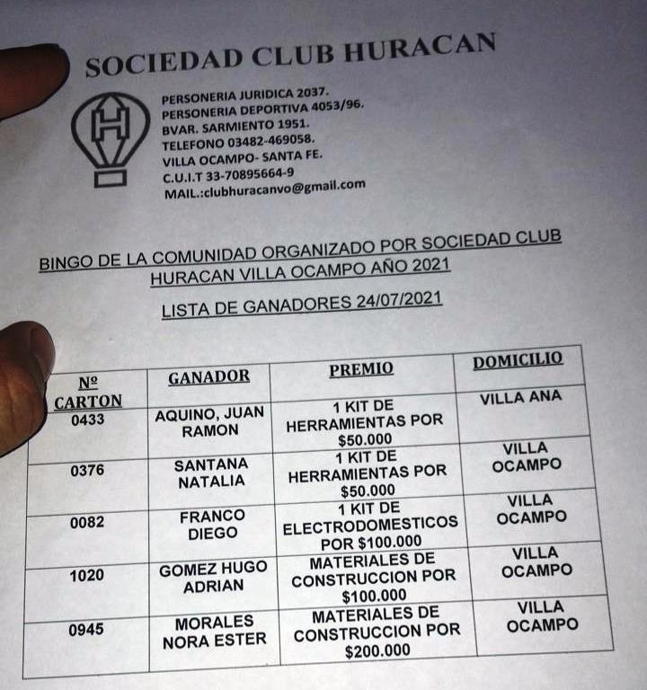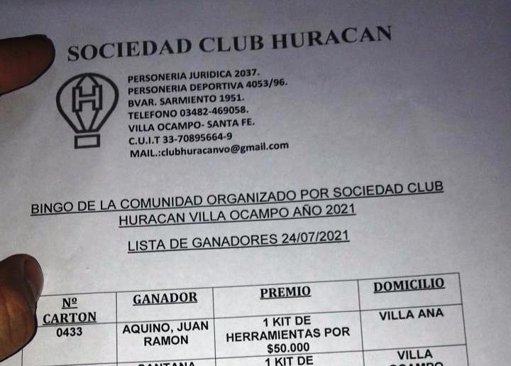 El pasado 24 de julio en las instalaciones del club Huracán de la ciudad de Villa Ocampo, se realizó el denominado «Bingo de la Comunidad», organizado por esta institución deportiva y social de esta ciudad.
