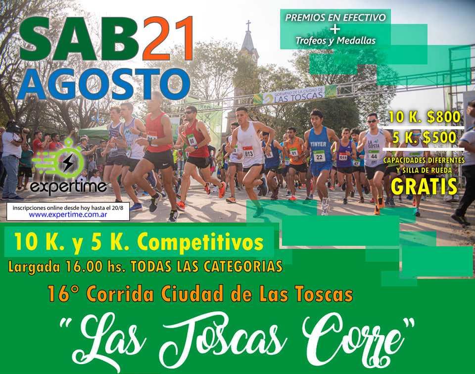Este sábado 21 de Agosto, a las 16 horas en la plaza 23 agosto, se llevará a cabo una de las competencias más importante de la ciudad y la región, la 16ª Corrida Ciudad de Las Toscas», para todas las categorías.