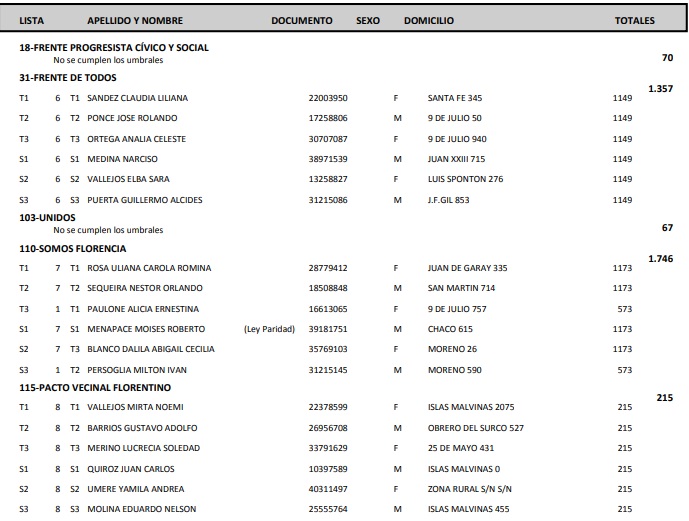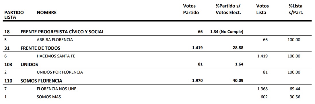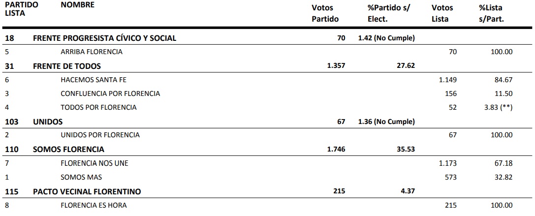 . Somos Florencia sacó el 35.53%, FdT el 27.62% y Pacto Vecinal Florentino el 4.37%.
