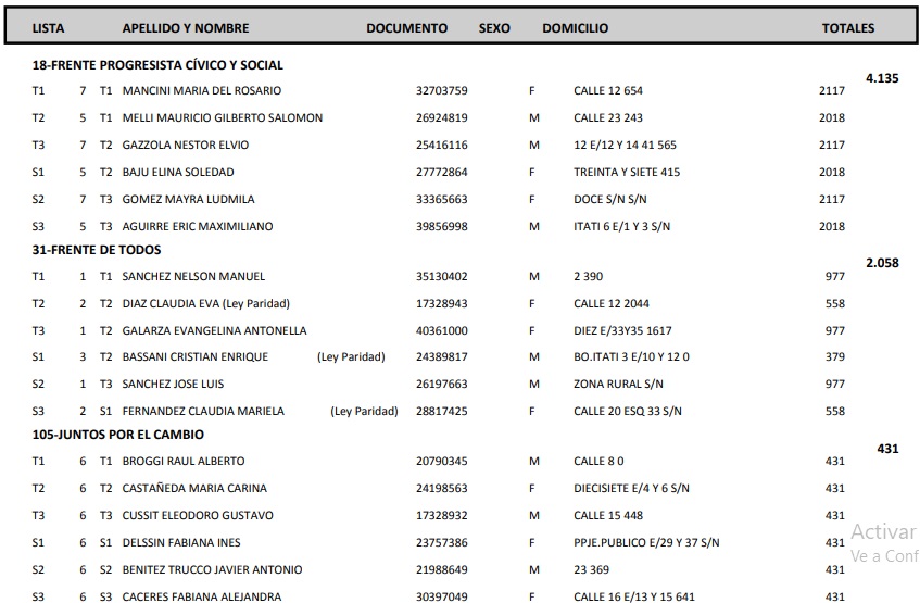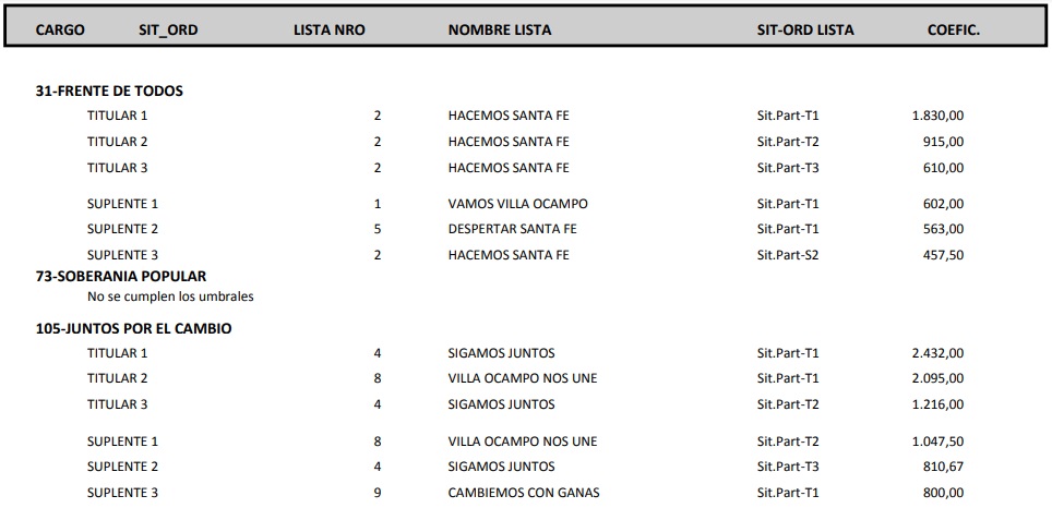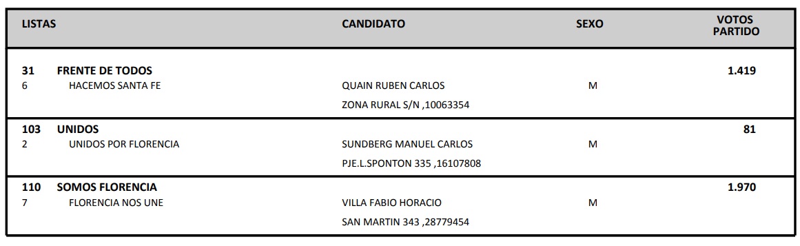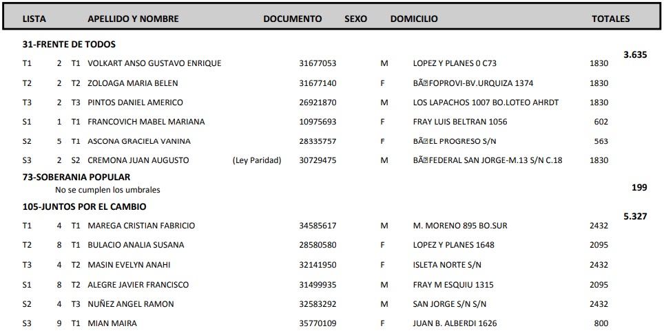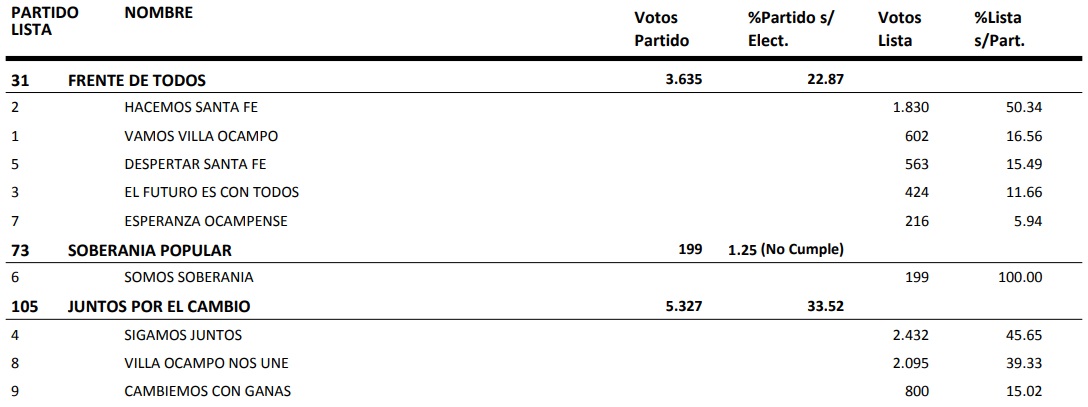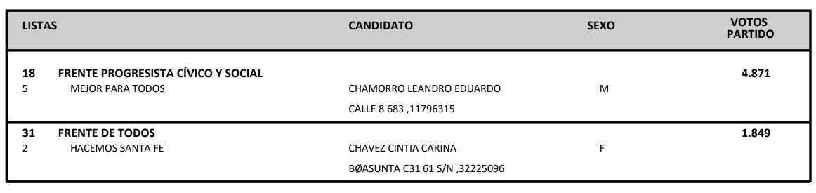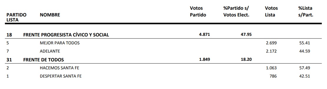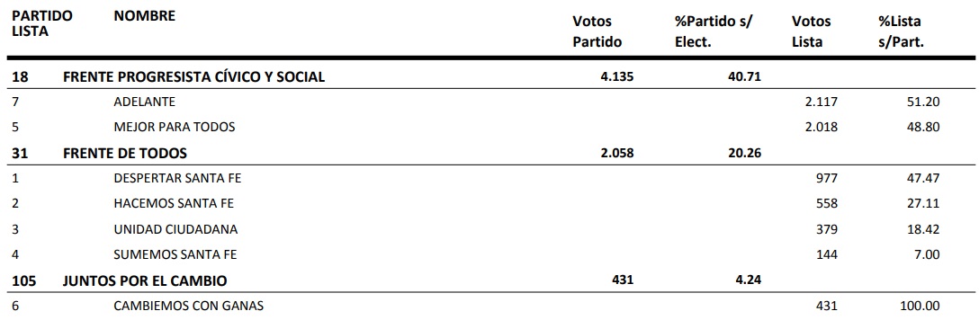 . La lista Adelante de Mancini ganó por 99 votos a la lista Mejor para Todos de Melli. Y Sánchez del FdT, lista Despertar Santa Fe.